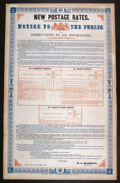 On and after 10th January next, the Single Rate of Inland Postage, on all Letters, except those between the United Kingdom and the Colonies and Foreign Countries, will be the Uniform Single Rate of One Penny.