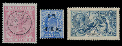 A 1867-83 5/- with superb Halifax cds sold for £960, a very fine example of 1915 De La Rue Seahorse 10/- sold for £1800 and a 1902-3 Office of Works 2½d overprint with a BPA cert sold for £1380.