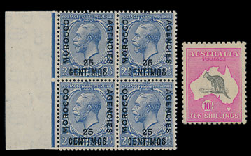 A bidder paid £228 for an Australia 1915-27 Kangaroo 10/- in aniline pink and a collection of Morocco Agencies overprint issues including blocks & varieties found a home for £750.