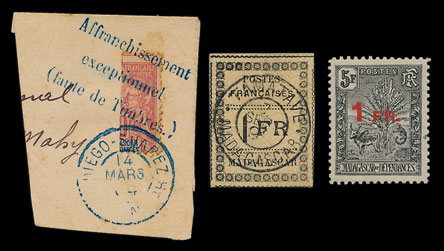 Before Madagascar became a French Colony in 1895, Britain had close diplomatic links with the Merina monarchs, resulting in the issue of Consular stamps for local and overseas mail. A collection of Madagascar issues from British Consular stamps, French Post Offices, Madagascar & Dependencies through to Independence in 1960, described as ‘rarely seen this complete’ sold for £900,