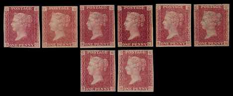 A collection of 1864-79 1d red imprimaturs, with plate numbers from 72 to 219 were offered as individual stamps in the auction. The lots sold on average for around £130 per stamp.