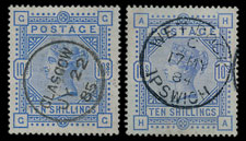 A pair of 1883-4 10/- on blued paper and each with a fine cancel sold for £3,120 & £2,880.