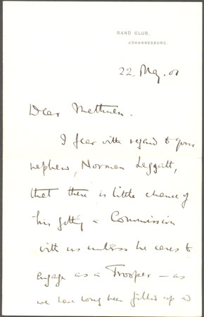 An interesting item in our August 2011 philatelic sale was a letter written by Robert Baden-Powell on May 22 1901, on notepaper headed Rand Club, Johannesburg. He is writing to A.M. Methuen of Haslemere, Surrey, about his nephew Norman Leggatt, who is hoping for a commission in the army. Baden-Powell says that his application is unlikely to succeed as “there are over 6000 candidates on our books for commissions.” The letter is accompanied by its envelope, also in the hand of Baden-Powell, bearing his signature lower left. The envelope has been forwarded from Haslemere to Bayswater and in doing so the forwarder has stuck through the signature. The person to whom he was writing was Lord Methuen who was one of the commanders of the British Army inSouth Africa. It was Lord Methuen who commanded the British forces at the Battle of Modder River. This battle although technically a success for the British forces resulted in 70 dead and over 400 wounded and was the first major setback suffered by Lord Methuen during the first attempt to relieve the siege ofKimberley. Lord Methuen was unprepared for the battle and lacked leadership experience.