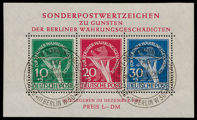 A Berlin 1949 Relief Fund M/S with superb cds cancels sold for £396.
