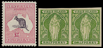 Also in the British Commonwealth section, Australia Kangaroo high values sold well, with a 1915-27 £2 achieving £1,740. A British Virgin Is 1899 imperforate pair (possibly a colour trial) sold for £324.