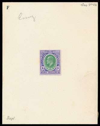 Amongst the essays this 1904-12 1/- design mounted on a large card sold for £5,160, a similar design for the same issue, in green & claret, sold for the same price.