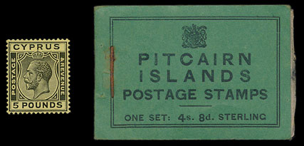 A Cyprus 1928 £5 realised £2,220 and a rarely seen Pitcairn Island 1940 stapled booklet achieved £720.