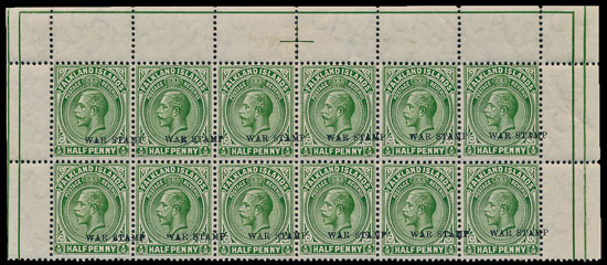 From the same collection a 1918-20 ½d War Stamp in part sheet with margins and showing various varieties amongst the 12 stamps, sold for £1530.