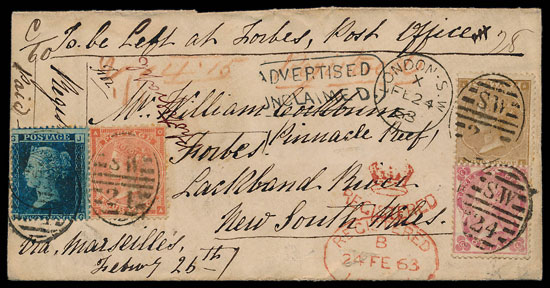 An 1863 cover to New South Wales with various stamps & cancels sold for £1,710.