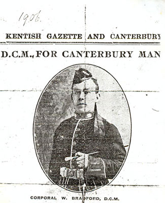 A Canterbury newspaper article in early 1915 believed the DCM was awarded to Corporal Bradford for action near Ypres on 14th November 1914 when “He had a very narrow escape then while on patrol duty and later, nearly the whole of a trench from which he was firing was blown up by shell fire. Bradford was buried by the fall of earth and the three men next to him were blown to pieces. The two officers were also killed.”
