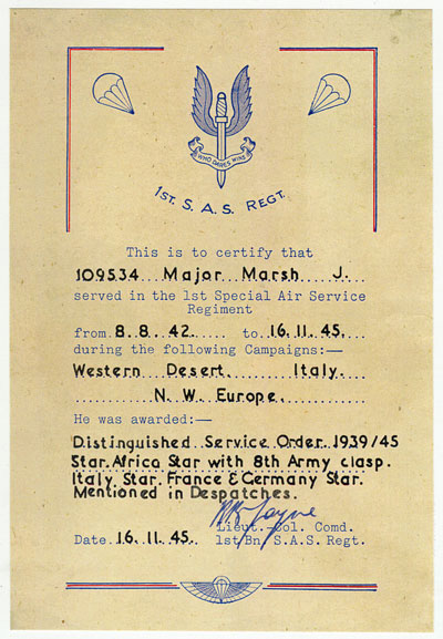 The award of the D.S.O. to Captain Marsh was announced in the London Gazette dated 27th January 1944 for action with the Special Raiding Squadron at Termoli in October 1943. The citation was: