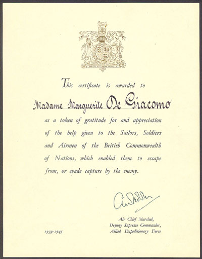Madame Margueritte di Giacomo was a member of the Shelburn Resistance Group near Paris in 1944. She was a young mother who ran a hostel for hiding escaping Allied airmen and also assisted by guiding them through German lines. The various commendations show she helped between 36 and 40 airmen to escape, a remarkable woman.