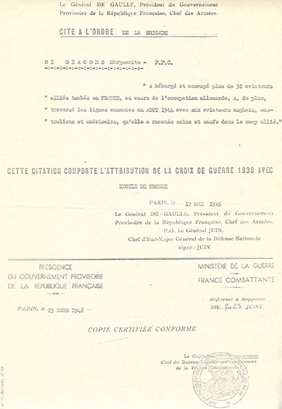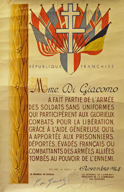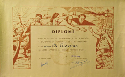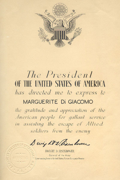 “Madame Di Giacomo, French Civilian, for exceptionally meritorious achievement which aided the United States in the prosecution of the war against the enemy in Continental Europe, from December 1943 to August 1944. She distinguished herself by her great courage, ingenuity, and determination in the performance of hazardous missions. Completely disregarding her personal safety she assisted directly in the evasion of thirty eight Allied airmen, and, through her unselfish devotion to the Allied cause contributed materially to the success of the war effort, thereby meriting the praise and recognition of the United States of America.”