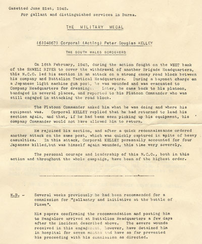 On the 14th February 1945 the Japanese launched a series of attacks against the Allied bridgeheads across the Shweli River. It was during these actions that Corporal Kelley earned the award of the Military Medal.