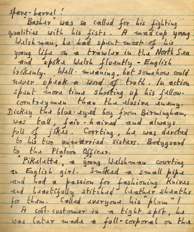 To round off my picture without a mention of the men with whom it was my privilege to fight would be to leave this tale sadly incomplete. Of John, need more be said? Yes, one thing only and that is his complete disregard for personal danger in tight spots. To sum up, I saw him once sitting in a one man fox-hole reading “The Stars Look Down”. The Japs were about to attack again but John calmly sat there and told a signaler to “ring ‘em up and tell ‘em to hold everything ‘till I’ve finished the chapter!” Can you beat it? Besides John and myself there was – “Griff”, a devil-may-care young Welshman, he was lance corporal in charge of my light machine gun. He courted danger in the same light hearted manner in which he courted his sweetheart in South Wales, and it earned him a periodical MM for gallantry and devotion to duty. A former miner, he took life – and death – very casually….