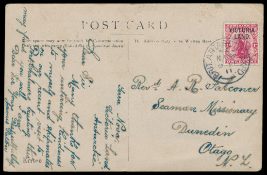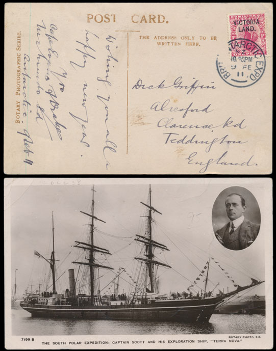 The third postcard, from expedition secretary and Assistant Postmaster Francis Drake, represents the first correspondence to reach the UK from Scott’s journey. Dated 9th February 1911 it is again franked with the New Zealand 1d stamp overprinted “Victoria Land” and cancelled with the expedition postmark. The postcard itself depicts the “Terra Nova” ship and Captain Scott.