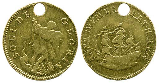 Lot 428 in our 9th December 2015 auction is this reign of Queen Anne gold touch piece designed by J. Croker. The reverse shows St. Michael slaying the dragon, the obverse shows a ship. It has a diameter of 21mm and weighs 3.03g. It is pierced for use and is graded as fair/fine.