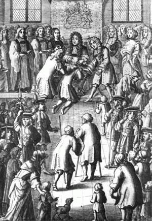 From the middle-ages it was a commonly held belief in England and France that a monarch’s touch could heal the skin disease known as scrofula or the ‘king\'s evil’. The sovereign was believed to be divinely appointed by God himself and could therefore act as a conduit to cure sickness in their people. Court ceremonies were held periodically for the reigning monarch to lay hands on or ‘touch’ the afflicted to cure them.