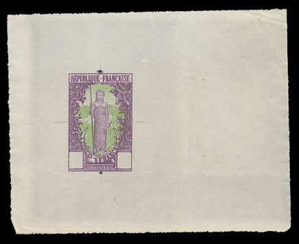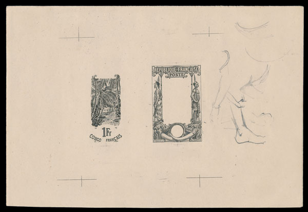 Lot 450, a very impressive range of Die Proofs for the 1900 French Congo values includes a total of seventy one proofs and a further twenty four colour trials. Aesthetically this collection is beautiful and features frame/vignette only prints as well as blocks of four and imperf colour trials. These Die Proofs offer great insight into the way the final prints are constructed. The image below exhibits how both the central design and the border exist as two separate entities that are then combined during the printing process. A gap is left for the stamps value to be inserted and the space remaining in the middle allows the design to sit between the border with just enough room on the lower animal tusks for ‘Congo Francais’ to be printed. Proofs such as these and the others available in this sale are great examples of postal history and demonstrate the creative processes involved in the design of philatelic material.