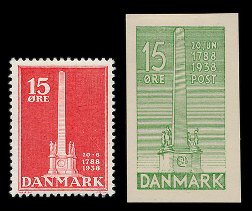 Lot 427 includes over two hundred Danish essays comprised within an album. Featured in this collection are mainly unadopted stamp designs from the 1930s and it is rare for material like this to be sold in the UK. If you compare these essays with the adopted designs the creative changes that take place during the process of designing a stamp become clear. For example the 1938 150th Anniversary of Abolition of Villeinage (pictured below in green) is very different to the final issue (also pictured) despite still maintaining the same prominent depiction of the monument. There is a visible change in both the use of colour and the detailing. The finalised design utilises a block colour red backdrop whilst the unadopted features horizontal green lines that build to create shade on both the background and the central monument. There are also differences in composition with the genuine stamp featuring the value and date at opposite corners as opposed to the equal placement of these two figures on the unadopted design. Although largely similar these two designs illustrate how the design process transitions through ideas before ultimately settling on a singular design that will be mass produced and sent across the globe on the outside of envelopes.