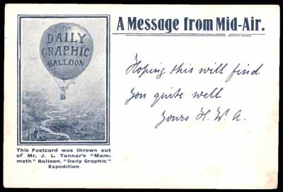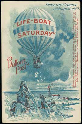 The 1903 Lifeboat Saturday balloon-flown card sold in auction in 2010 for £920. The message on the reverse reads “Sky 4.30 pm, Dear Muriel, It is jolly cold up here”. A father sent this card to his daughter as a souvenir of the flight.