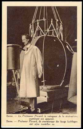 The Swiss physicist Auguste Piccard wanted to measure the activity of cosmic rays in the stratosphere and investigate Einstein's theory of relativity. He constructed a pressurised aluminium capsule and attached it to a large hydrogen balloon. In May 1931, with an assistant, Paul Kipfer, he took off from Augsberg, Germany and reached a record height of 9.8 miles. They crash-landed on a glacier in the Austrian Alps. Piccard made 26 further balloon flights, climbing to an incredible altitude of 14 miles. This printed card was published as a publicity card by the Belgian chocolate firm Lecocq.