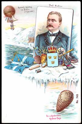 Professor S.A. AndrÄ—e, was a Swedish balloonist who, with two others, left the north coast of Spitsbergen in northern Norway, in July 1897, in an ill-conceived attempt to cross the North Pole by hydrogen balloon. They crash-landed the leaking balloon on the pack ice after only two days and spent the next 12 weeks walking back over the ice to land. They died of exhaustion on the uninhabited White Island of Spitsbergen. This undivided back chromo-litho card, published in Germany, commemorates the expedition.