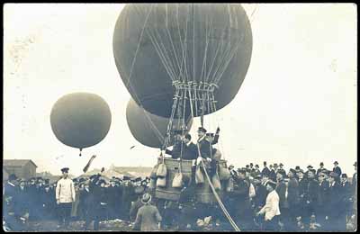 Flying at the mercy of the elements, in a gondola suspended below a balloon containing hot air or a gas lighter than air, was a tradition over 100 years old by the time that picture postcards were in the ascendancy at the end of the nineteenth century. However postcards commemorating balloon flights are rare. Perhaps the reason for this is that the events themselves were rare, especially in Great Britain. The first balloon flight in England took place in 1784 and the English Channel was successfully crossed in a balloon a year later. Every student of French philately will have heard of the ballons montÄ—s and non-montÄ—s that were employed to despatch letters and carrier pigeons from the surrounded city of Paris during the Franco-Prussian war of 1870-1. Many of the balloons successfully flew over the Prussian lines and their cargo was eventually delivered. However the problem with carriage of mail by balloon is that the balloon’s path is dictated by the wind and cannot be relied on. In the 1890s and later, balloons were often inflated at exhibition venues, especially on the continent, and in most cases they remained tethered to the ground. In some instances flights were organised and occasionally the carriage of commemorative mail was offered.
