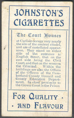 Before the First World War there were a large number of small, independent cigarette manufacturers operating in the United Kingdom, some of whom were absorbed into larger concerns and some of whom disappeared without trace. One such company, about which very little is known, was the Carlisle firm of Johnston. Around 1910 they issued cigarette cards but they remained unrecorded until the Cartophilic Society published the 4th supplement to their Index, in 1990. In this supplement they gave the set the title “British Views”, but it is clear that the only card reported at that time was a view of Carlisle Castle. Warwick and Warwick sold an example of this particular card in the November 2004 auction, where it realised £345, including the buyer’s premium. At the time we speculated whether other cards really existed from this apparent series, or whether this was the only card published before the company succumbed to commercial pressures and ceased trading, or became the subject of a takeover.