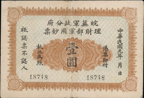 Lot 382 in our 17th October 2018 auction is this rare Chinese The Wang-Ho Bank of the Republic, Military Bank-Note, dated 1912, One Dollar Local Currency, with serial number 18748. It measures 142mm by 97mm. The obverse is printed with green ink, the reverse with brown over a green under print. The obverse is also overprinted with Chinese script in black ink and is graded as good fine. It has an auction estimate of £2,000.