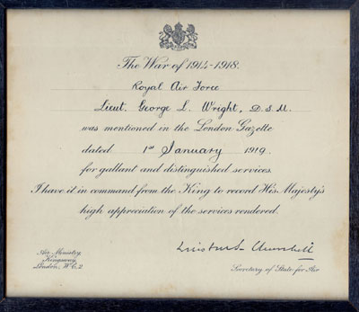 Lieutenant Wright was mentioned in dispatches for distinguished service in war areas in the London Gazette dated 1st January 1919 and relinquished his R.A.F. commission on 1st September 1921.