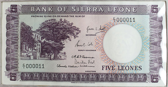 And this Bank of Sierra Leone 1964 issue set of 3 uncirculated banknotes, housed in a De la Rue, London leather type presentation folder is estimated at £400.