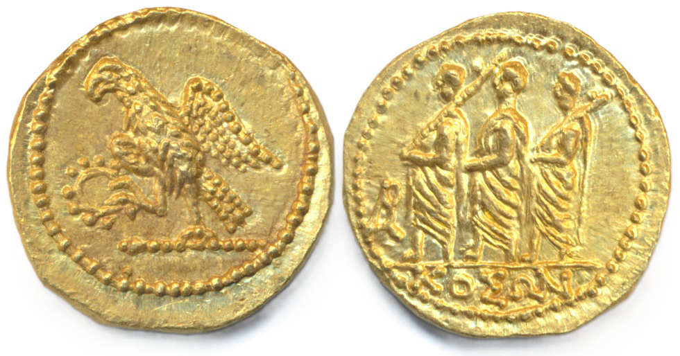Lot 170, from Ancient Greece we have a fine example of Ancient Greece, Thrace, Koson. Circa mid-first century BCE gold stater, 8.35g, obverse 3 togate figures advancing left, the first and third carrying an axe over left shoulder, reverse eagle standing left of sceptre holding wreath in one claw, very fine. Unknown dynast, possibly Scythian whose coinage seems to be inspired by silver denari issued in 54 BCE by M. Junius Brutus.