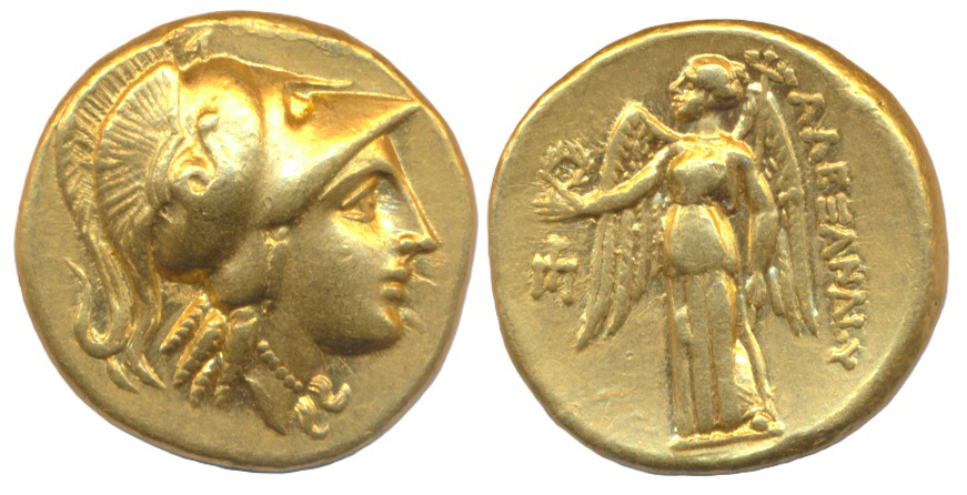 Lot 212 is a lovely Ancient Greece, Macedonian, Alexander III, The Great. 336-323 BCE gold stater, 8.53g, obverse Bust of Athena right in Corinthian helmet with serpent, reverse Nike standing left holding wreath, good fine, with James Murphey ticket.