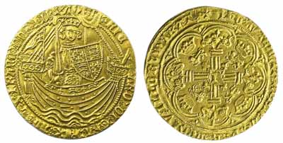 Lot 418 is a Richard II noble. From the Calais mint the obverse shows the King standing in a ship, with a sword and shield. A flag is shown on the stern of the ship. On the reverse there is a letter R in centre of the ornate cross. It is graded as \'good very fine\' and is estimated at £7,000.
