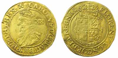 Lot 426 is this Charles I unite, second bust with mintmark castle. It is graded as \'good fine\' and is estimated at £1,500.