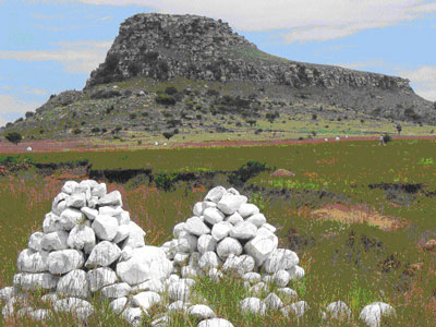 Cairns placed above buried soldiers cover the battlefield, indicating the huge area over which the battle was fought. This photo was taken near where it was thought some of G Company personnel finally fell, with Isandhlwana hill in the background.