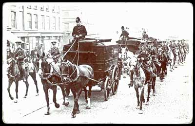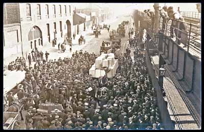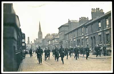 A mass meeting and demonstration took place in front of St George’s Hall on Sunday August 13 and the T.W.F leader, Tom Mann, addressed a crowd of about 100,000 workers. The demonstration was peaceful until 4pm when, apparently unprovoked, the police attempted to clear the steps of St. George’s Hall and started attacking members of the crowd. The fighting spread to surrounding streets and dozens of injuries were sustained by the strikers, the police and the troops. The day became known as Bloody Sunday. Fighting continued for several days and when a prison van containing arrested strikers was attacked by other strikers, two workers were shot dead by troops. Any movement of goods within the city was now closely guarded by troops, the majority of which were from regiments some distance from Liverpool, because the authorities were concerned about the loyalty of local Territorials. Eventually the railway workers entered into talks with their employers and the strike was ended on August 21.