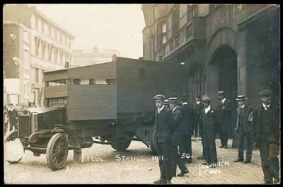 A postcard publishing company in Liverpool, with the name of Carbonora, published a fine series of real photographic postcards of Liverpool during the period known as the “Golden Age” of postcards. One of the events which they covered was the 1911 Liverpool transport strike. The years between 1910 and the outbreak of the First World War in 1914 constituted a period of significant industrial unrest in Britain. This particular strike was started by merchant seamen objecting to working conditions in the port of Southampton and it quickly spread to other significant ports like Liverpool. Although the grievances of the National Sailors’ and Firemen’s Union were resolved in Southampton, the strike in Liverpool became more broadly based and dockers, railway workers and people from other trades affiliated to the Transport Workers Federation joined the strikers. Commerce in Liverpool was paralysed for most of the summer months of 1911 when transport within the city came to a standstill. Troops and police were drafted in to maintain order.