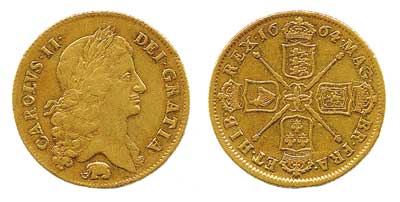Charles II 1664 two guineas, elephant below, very fine, est. £1,000, realisation £1,955.