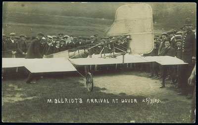 In 1909 the Daily Mail offered a prize of £1,000 to the first aviator to cross the English Channel. Again a race developed and the story of Louis Blériot\'s successful crash landing at Dover is well known. The Daily Mirror printed a postcard of the landing and it is very common. Unsurprisingly it does not mention the Daily Mail prize. Blériot\'s aircraft was exhibited at Selfridges in London on the day after the historic crossing and they issued a series of printed cards to mark the event. These were published by Tuck and they are equally as poor in definition as the Daily Mirror cards. Real photographic cards of the event are much rarer.