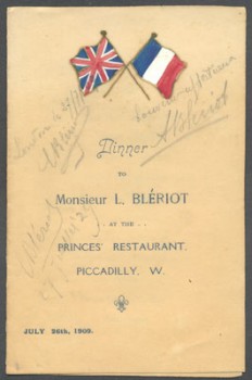 1909, July 26th, menu for dinner, at the Prince\'s Restaurant, Piccadilly, in honour of Louis Blériot, who crossed the English Channel by aeroplane on the previous day, signed L. Blériot and dated London le 27/7/09 and again signed by him and dated 27 Juillet \'29, on the occasion of the closing banquet of the 7th International Aero Exhibition. The menu is also signed by his wife.