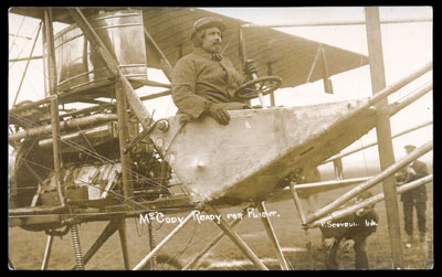A wonderfully detailed real photographic card of \"Colonel\" S.F Cody about to make a flight in his monoplane. He died in 1913 when piloting a seaplane in preparation for the 1913 Daily Mail Circuit of Britain air race.