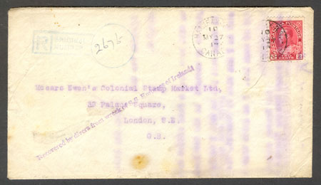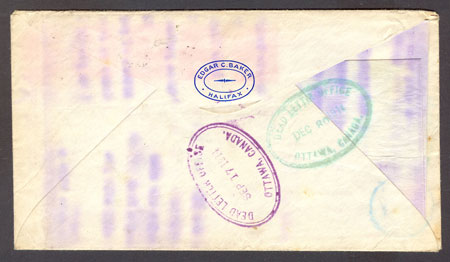The ship had sunk in relatively shallow water, not far from shore and as it was carrying £200,000 worth of silver bullion, the underwriters decided to carry out salvage operations. Much of the mail was recovered, dried out and handstamped with the cachet “Recovered by divers from the wreck of SS Empress of Ireland”. The reverse of the covers were date stamped with the oval stamp of the Dead Letter Office in Ottawa, from where the recovered mail was transported to the recipients.
