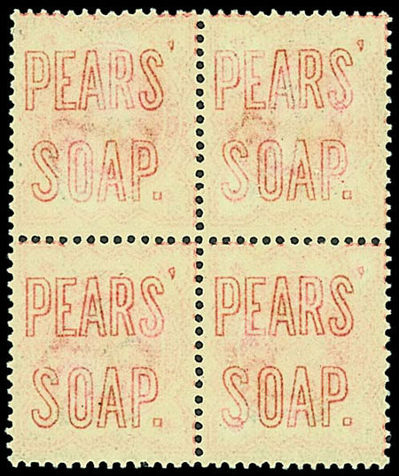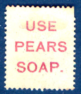 Around 1889, the company De La Rue, who held the contract for printing postage stamps, were requested by the Postmaster General to investigate printing advertisements for Pear’s Soap on the backs of stamps. As a trial, they printed the words “PEAR’S SOAP”, in double-lined capitals, in mauve, under the gum, on the backs of the 1881 1d. lilac and the 1887 Jubilee ½ d. vermilion. The records show De La Rue reported difficulties with the task and the Postmaster General never proceeded with the idea. Occasionally examples appear on the market and Warwick and Warwick’s sale of March 2008 saw a block of four of the ½ d. vermilion realise £920.