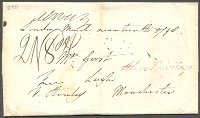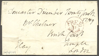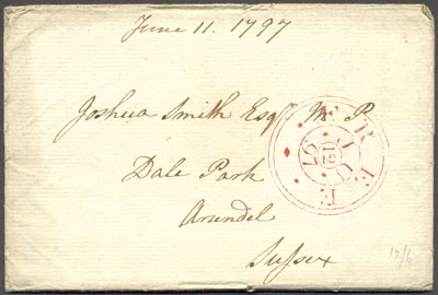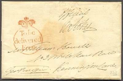The abuse of the free franking system was so enormous that the government sought to control it in 1795. The weight limit per item was reduced to 1 ounce and each MP was allowed to send only 10 letters per day and receive only 15. A variety of instructional handstamps, such as “Above Privilege” came into use by the inspectors. The above entire sold for £299 in December 2010.