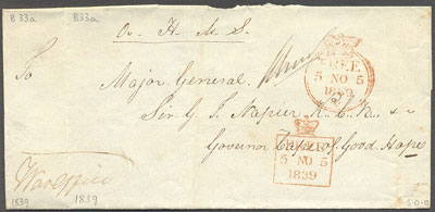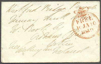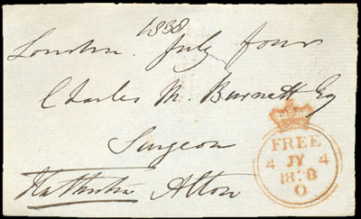 A free frank which has created a great deal of controversy is the crown above double circle with “O” below the date slug. James Grimwood-Taylor, in his article in “The London Philatelist” of October 1999, convincingly argues that this strike was applied by favour posthumously to free fronts collected by autograph collectors of the 1840s and 1850s, seeking to make more presentable signed fronts which had not received a postal marking. Very few examples exist and those that do are on fronts rather than entires.