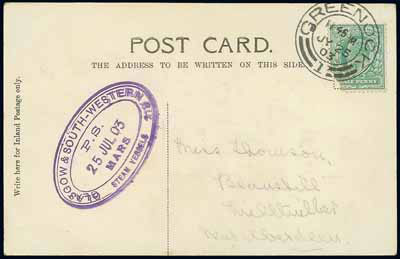 The postmarks used on mail conveyed by the Clyde steamers are well collected and a particularly rare strike is the double oval “GLASGOW & SOUTH-WESTERN RLY. / STEAM VESSELS / P.S. / 25 JUL 03 / MARS”, used on the “Mars” paddle steamer. Estimated at £50, it made £748!