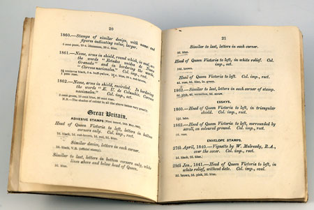 The archive includes early stamp catalogues such as that issued by Mount Brown in 1862. It is the second edition of his catalogue and it is bound in leather and has gold tooling. There are no illustrations, but every issued stamp is described, though not priced. Strangely, on the G.B. page, the issue date of the 1d black is stated as 13th May 1840. I wonder if this was corrected to 6th May in the third edition.