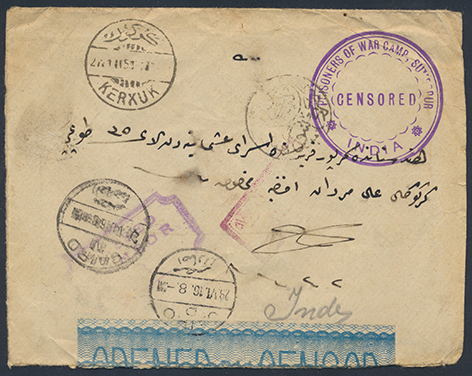 Here is a cover sent from Sumerpur from Kerkuk, in modern-day Iraq, via Cairo. At the base, you can see that the cover was opened by an Ottoman censor and resealed. In the top-right is a neat Sumerpur POW camp censor cachet is violet, indicating that it had been censored by the camp interpreter before being released.